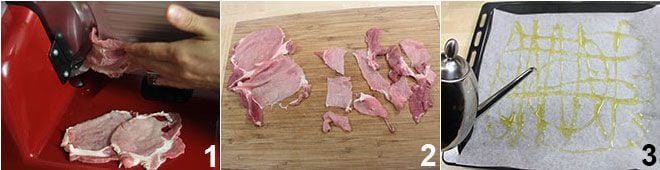 Um den Gyros zuzubereiten, beginnen Sie damit, das Fleisch fein zu schneiden, mit Hilfe einer Aufschnittmaschine, weil es sehr dünn sein muss 1, und reduzieren Sie die geschnittenen Scheiben in kleinere Stücke 2. Legen Sie ein Backblech mit Backpapier aus, ölen Sie es ein 3