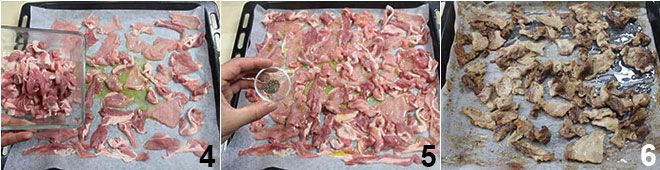 und legen Sie die Fleischstücke darauf 4. Würzen Sie sie mit einer Prise schwarzem Pfeffer 5 und backen Sie sie in einem vorgeheizten Ofen bei 180 °C für 30 Minuten 6: Das Fleisch sollte gut durch und knusprig sein.