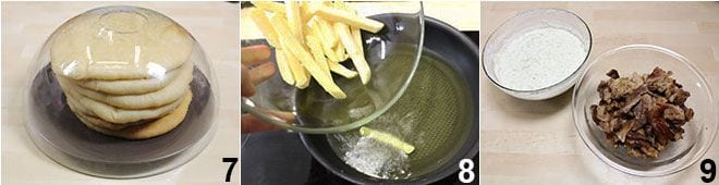 Bereiten Sie die Pitas zu, indem Sie dem Verfahren folgen, das Sie Pita (Pita) finden, und lassen Sie sie, sobald sie aus dem Ofen kommen, unter einer Glasglocke bis zur Verwendung stehen 7. Frittieren Sie die Pommes 8 und halten Sie sie warm, dann geben Sie das Fleisch in eine Schüssel und nehmen das Tzatziki 9, das Sie bereits gemäß den Anweisungen, die Sie hier (Tzatziki) finden, zubereitet haben.