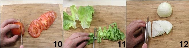 Schneiden Sie alle Gemüse, die Sie für die Füllung der Gyros benötigen: Waschen Sie die Tomaten und schneiden Sie sie in Scheiben 10, waschen Sie den Salat und zerkleinern Sie ihn in kleinere Stücke 11 und schneiden Sie die weiße Zwiebel fein 12.