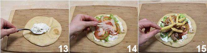 Nun können Sie Ihre Gyros zusammenstellen: Auf jede Pita streichen Sie einen Löffel Tzatziki 13, füllen Sie mit etwas Salat, den Tomatenscheiben und ein paar Zwiebelringen 14. Fügen Sie das Fleisch hinzu und zum Abschluss ein paar Pommes 15. Schließen Sie den Gyros, beginnend von unten, erhitzen Sie ihn für ein paar Minuten im Ofen und servieren Sie ihn heiß!