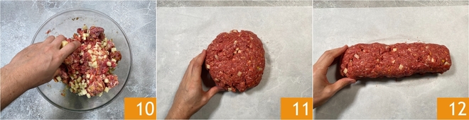 Kneten Sie weiter mit den Händen in der Schüssel, bis Sie eine homogene Masse erhalten 10; dieser Schritt ist entscheidend für ein gutes Ergebnis beim Kochen 11. Legen Sie die Masse auf ein Blatt Backpapier 11 und formen Sie einen Hackbraten, der etwas kürzer als der Durchmesser Ihrer Pfanne ist 12.