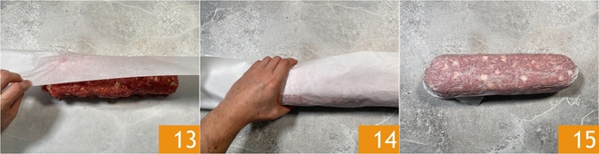 Wickeln Sie den Hackbraten in das Backpapier 13, ziehen Sie es fest 14 und verschließen Sie es, indem Sie die Enden nach unten falten 15. Lassen Sie den Hackbraten 10 Minuten im Kühlschrank fest werden.
