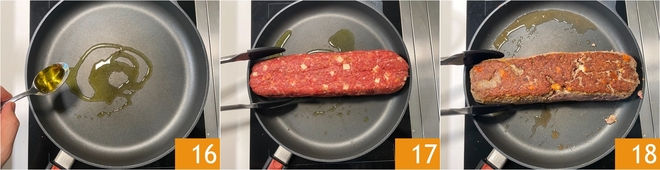 Nach der Festigungszeit erhitzen Sie das Öl in einer großen Pfanne 16, dann legen Sie vorsichtig den Hackbraten hinein und lassen ihn auf einer Seite anbraten, ohne ihn zu berühren 17. Drehen Sie den Hackbraten mit Hilfe einer Zange, damit er auch auf den anderen Seiten anbraten kann 18; insgesamt dauert dies 12 bis 18 Minuten.