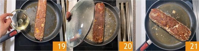 Löschen Sie nun mit dem Weißwein ab 19 und lassen Sie den Alkoholgeruch vollständig verdampfen, dann decken Sie mit einem Deckel ab 20. Kochen Sie bei mittlerer bis niedriger Hitze weitere 12 Minuten. Ihr Hackbraten in der Pfanne ist bereit, zusammen mit seinem köstlichen Bratensaft serviert zu werden 21!