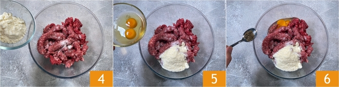 Für die Zubereitung des Hackbratens in der Pfanne geben Sie das Rinderhackfleisch und die Wurst in eine Schüssel 1, dann würzen Sie mit Salz 2 und Pfeffer 3.