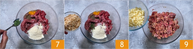Aromatisieren Sie zusätzlich mit der getrockneten Schnittlauch 7 und fügen Sie schließlich das rustikale Paniermehl hinzu 8. Mischen Sie mit den Händen, um die Zutaten zu kombinieren, dann fügen Sie den in Würfel geschnittenen Greyerzer hinzu 9.