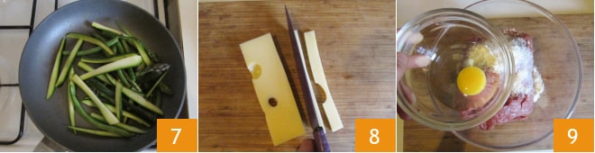 Am Ende des Kochvorgangs sollten sie knackig sein; lasst die Karotten, Spargel, Bohnen und Zucchini beiseite, um sie abkühlen zu lassen 7. Schneidet den Käse in Scheiben 8 und knetet den Hackbraten. In einer Schüssel vermischt ihr das Hackfleisch mit geriebenem Grana Padano DOP, dem Ei 9,