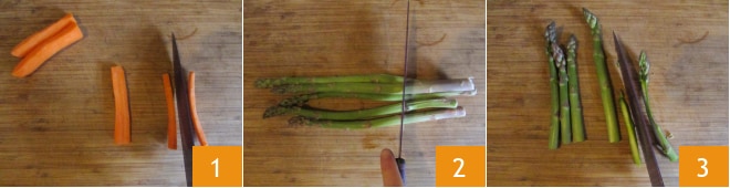 Um den Hackbraten mit Gemüse und Käse zuzubereiten, beginnen wir mit der Füllung. Nachdem ihr die Karotten geschnitten und geschält habt, schneidet sie in Stäbchen von etwa 7-8 mm 1. Dann schneidet den holzigen Teil der Spargel 2 ab und halbiert sie 3.