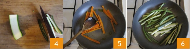 Schließlich schneidet ihr die Zucchini ebenfalls in Stäbchen, sie sollten alle ungefähr die gleiche Größe haben 4. Nun geht es ans Kochen. In einer Pfanne gebt ihr einen Schuss Öl und lasst alles bei mittlerer Hitze etwa 5 Minuten garen 5. In einer anderen Pfanne bratet ihr die bereits geschnittenen Spargel, Zucchini und grünen Bohnen zusammen mit einem Schuss Öl ebenfalls 5 Minuten an 6.