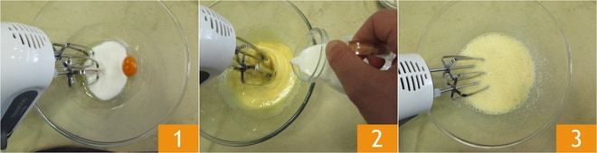 Um die Haferpfannkuchen zuzubereiten, beginnen Sie damit, das Ei mit dem Zucker mit einem elektrischen Mixer 1 zu verarbeiten. Sobald Sie eine schaumige Masse erhalten haben, fügen Sie langsam die Milch hinzu 2 und schlagen Sie weiter, bis sie eingearbeitet ist 3.