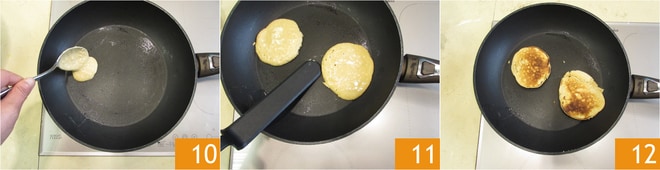 Wenn die Pfanne heiß ist, geben Sie einen oder zwei Esslöffel Teig hinein und formen Sie einen Pfannkuchen 10. Backen Sie ihn 3-4 Minuten und drehen Sie ihn dann vorsichtig um 11 und lassen Sie ihn weitere 2-3 Minuten backen, bis er goldbraun ist 12.