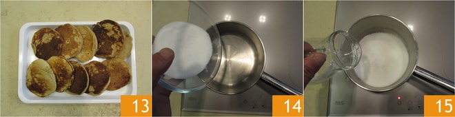 Stellen Sie die Pfannkuchen beiseite 13 und bereiten Sie den Karamell vor. Geben Sie den Zucker in einen Topf mit dickem Boden 14 und fügen Sie etwa 50 g Wasser hinzu 15.