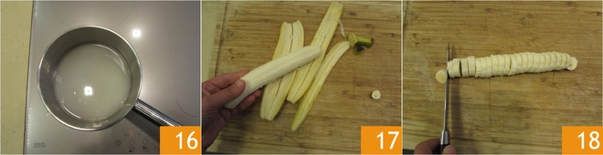 Bringen Sie es bei schwacher Hitze zum Kochen 16, bis es eine bernsteinfarbene Farbe annimmt. In der Zwischenzeit schälen Sie die Bananen 17 und schneiden Sie sie in etwa 1 cm dicke Scheiben 18.