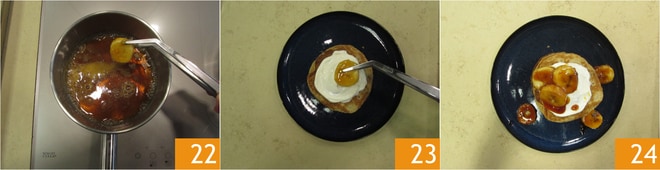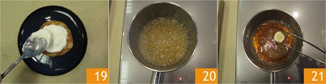 Legen Sie die Pfannkuchen auf einen Teller und garnieren Sie mit Mascarpone 19. Wenn der Karamell Farbe angenommen hat 20, schalten Sie die Hitze ab und tauchen Sie die Bananen hinein 21.
