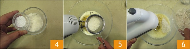 Mischen Sie das Weizenmehl mit dem Backpulver 4 und geben Sie es durch ein Sieb in die Mischung 5, fügen Sie dann das Hafermehl hinzu und verarbeiten Sie die Mischung 6.