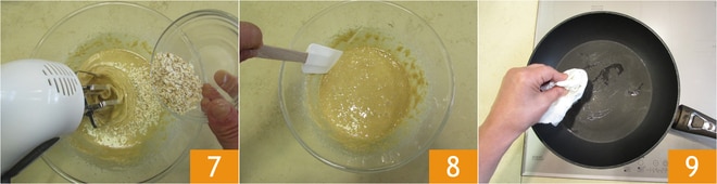 Fügen Sie schließlich die Haferflocken hinzu 7. Die Mischung ist bereit zum Kochen 8. Erhitzen Sie die Pfanne und fetten Sie sie mit etwas Butter ein 9.