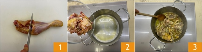 Um die Hähnchen-Cannelloni zuzubereiten, entbeinen Sie das ganze Hähnchen: Trennen Sie Schenkel und Unterschenkel, Brust und Flügel 1. Entfernen Sie von allen Teilen die Knochen und die Haut, und bewahren Sie die Überbleibsel auf. Spülen Sie diese Überbleibsel unter Wasser ab. In einem großen Topf erhitzen Sie etwas Öl, geben Sie die Knochen und die Haut hinein 2, braten Sie sie gut an 3, löschen Sie mit Weißwein ab und lassen Sie den Alkohol verdampfen.