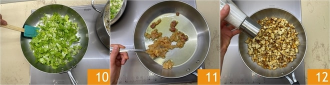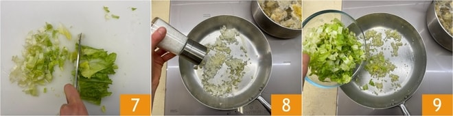 Hacke die Zwiebel und den Knoblauch, dann schneide 150 g Endivie in kleine Stücke 7. In einer Pfanne brate Knoblauch und Zwiebel an, salze 8 und füge die Endivie hinzu 9.