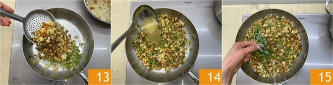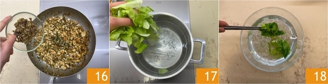 Am Ende der Garzeit die gehackten Taggiasca-Oliven hinzufügen 16 und mit Salz abschmecken. In einer Pfanne mit reichlich kochendem Salzwasser 100 g Endivie für ein paar Minuten blanchieren 17. Wenn sie gar ist, in einer Schüssel mit Eiswasser abkühlen 18.