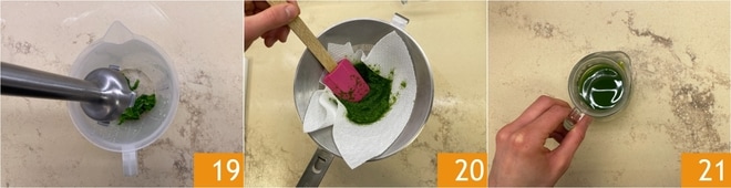 Pürieren Sie die Endivie mit dem Stabmixer, indem Sie 2 Esslöffel kaltes Wasser hinzufügen 19. Die Creme mit einem Papiertuch abseihen 20. Mischen Sie die erhaltene Flüssigkeit erneut mit 100 g Olivenöl extra vergine, um ein dickes aromatisiertes Öl zu erhalten 21.