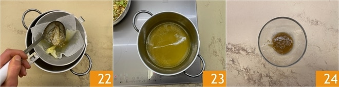 Inzwischen ist die Brühe fertig, filtern Sie sie 22 und bewahren Sie 3 Kellen auf. Gießen Sie die restliche Brühe in einen Topf und lassen Sie sie einreduzieren, um einen braunen Hühnerfond zu erhalten 23; sie sollte eine dichtere und sirupartige Konsistenz haben 24.