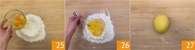 Bereiten Sie die frische Pasta zu: Auf der Arbeitsfläche das Mehl zu einem Brunnen formen, die Eier in die Mitte geben 25 und mit einer Gabel vermischen, um alles zu verbinden 26. Mit den Händen und kräftig etwa 10 Minuten lang kneten, um einen homogenen und elastischen Teig zu formen 27. Wickeln Sie ihn in Frischhaltefolie und lassen Sie ihn an einem kühlen Ort etwa 30 Minuten ruhen.