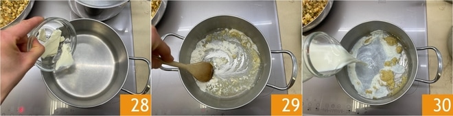In der Zwischenzeit können Sie die Béchamelsauce zubereiten: Erhitzen Sie die Milch in einem kleinen Topf. In einem anderen Topf die Butter schmelzen 28, dann das Mehl auf einmal außerhalb des Feuers hinzufügen und alles mischen 29. Zurück auf den Herd und etwa 2 Minuten lang unter häufigem Rühren kochen. Wenn sich der "Roux" gebildet hat, das heißt, der Teig goldbraun ist und sich vom Boden löst, die heiße Milch nach und nach unter Rühren mit einem Schneebesen zugeben, um Klumpen zu vermeiden 30.
