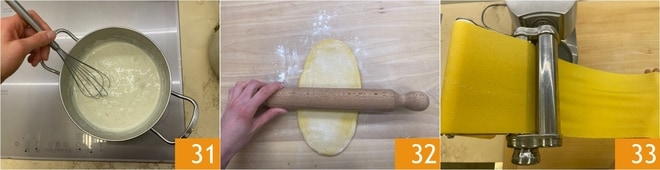 Salzen, pfeffern und alles kochen, bis es eindickt, dann die Béchamelsauce bei Raumtemperatur abkühlen lassen 31. Bestäuben Sie den Teigblock mit frischer Pasta, glätten Sie die frische Pasta leicht mit einem Nudelholz 32, dann führen Sie sie durch die Nudelmaschine von der dicksten bis zur dünnsten Einstellung, bis Sie ein Blatt von etwa 2 mm Dicke erhalten 33.