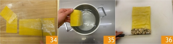 Schneiden Sie Rechtecke von 12x9 cm aus der Pasta 34. Die Teigrechtecke für etwa 1 Minute in kochendem Salzwasser blanchieren 35. Auf einem mit einem Geschirrtuch bedeckten Tablett abtropfen lassen. In einer Schüssel das Hähnchenragout mit der Béchamelsauce vermischen, wobei etwas Béchamelsauce zum Bestreichen der Auflaufform zurückbehalten wird. Füllen Sie jedes Teigrechteck, beginnend an der kurzen Seite, mit der erhaltenen Mischung 36.
