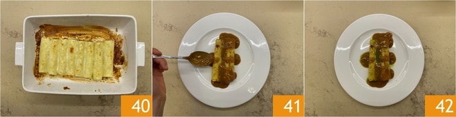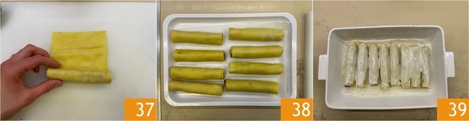 Rollen Sie den Teig auf, um die Cannelloni zu formen 37 und legen Sie sie nach und nach auf ein Tablett 38. In eine ofenfeste Form eine Schicht Béchamelsauce gießen, die Cannelloni anordnen und mit weiterer Béchamelsauce bestreichen, dann den geriebenen Grana Padano DOP darüber verteilen 39. Im vorgeheizten statischen Ofen bei 200°C für 15 Minuten backen.