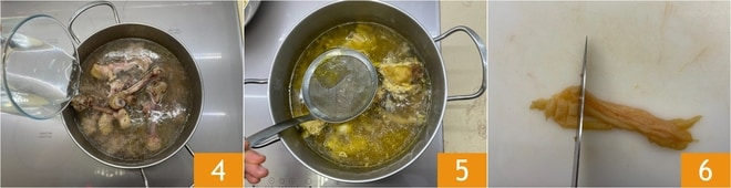 Fügen Sie kaltes Wasser hinzu 4 und lassen Sie es eine Stunde lang kochen, dabei gelegentlich abschäumen 5. Schneiden Sie das gereinigte Hähnchen in Würfel 6.