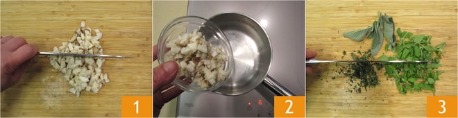 Um das Hähnchen mit Speck und Bierkartoffeln zuzubereiten, hacken Sie zuerst den Speck 1. Lassen Sie ihn in einem kleinen Topf schmelzen 2. In der Zwischenzeit hacken Sie fein Salbei und Majoran 3.