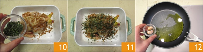 Würzen Sie mit den Kräutern 10 und dem pürierten Speckgranulat 11. Backen Sie im vorgeheizten Ofen bei 200° für mindestens 50 Minuten. Sammeln Sie alle 15 Minuten den Bratensaft und verteilen Sie ihn über das Hähnchen, um ein Austrocknen zu verhindern. In der Zwischenzeit kümmern Sie sich um die Bierkartoffeln: Waschen und schneiden Sie die Kartoffeln. In einer Pfanne Öl und Knoblauch erhitzen und aromatisieren 12.