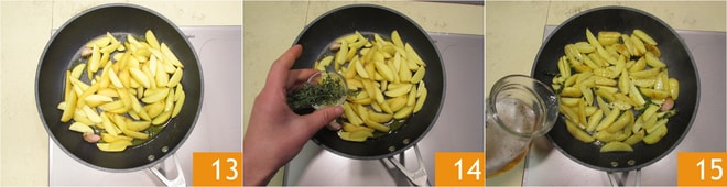 Geben Sie die Kartoffeln in die Pfanne 13, salzen, pfeffern und aromatisieren Sie mit den Thymianzweigen 14, braten Sie die Kartoffeln und geben Sie nach und nach das Bier hinzu 15.