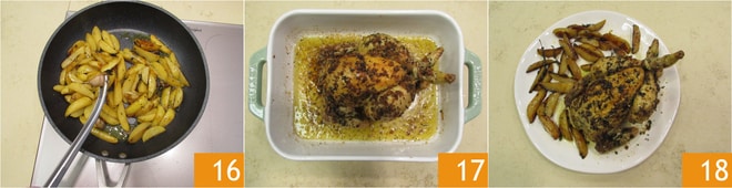 Setzen Sie das Kochen fort, bis sie goldbraun sind, entfernen Sie dann den Knoblauch 16. In der Zwischenzeit wird auch das Hähnchen fertig sein 17, servieren Sie es heiß mit den Kartoffeln 18.
