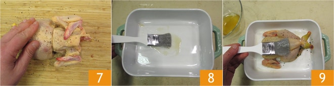 Pfeffern Sie von beiden Seiten 7. Fetten Sie eine Backform ein 8, legen Sie das Hähnchen hinein und bestreichen Sie es mit dem geschmolzenen Speck 9.