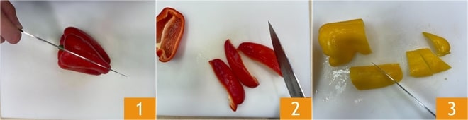 Um das Hähnchen mit Paprika auf römische Art zuzubereiten, waschen Sie zuerst die Paprika. Halbieren Sie sie 1 und entfernen Sie die Samen und die inneren Fasern. Schneiden Sie die Paprika in Scheiben 2 und dann in Stücke 3.