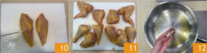 Teilen Sie die Brüste in der Hälfte, falls sie zu groß sein sollten 10. Sobald Sie das Hähnchen in Stücke geschnitten haben, salzen Sie es gut 11 und fahren Sie mit dem Kochen fort. Geben Sie in eine große Pfanne das Öl und 2 Knoblauchzehen 12.