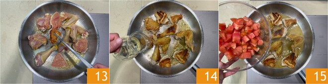 Fügen Sie dann die Hähnchenteile hinzu, und wenn sie gut gebräunt sind, drehen Sie sie um 13 und entfernen Sie den Knoblauch. Lassen Sie sie auch auf der anderen Seite bräunen und löschen Sie mit Weißwein ab 14. Sobald der Wein vollständig verdunstet ist, fügen Sie die Tomaten hinzu 15.