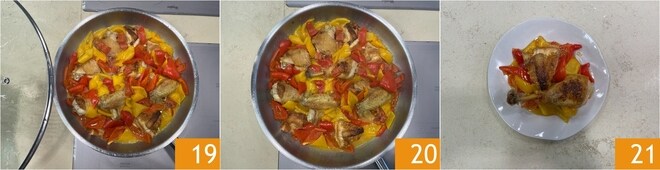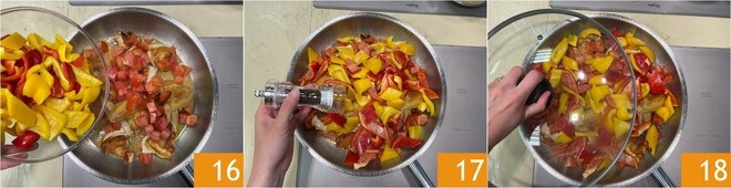 Fügen Sie auch die Paprika hinzu 16, Salz, Pfeffer 17 und decken Sie mit einem Deckel ab 18.