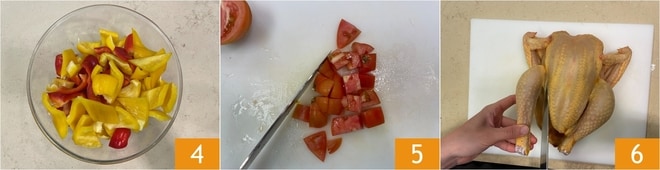 Sammeln Sie die gelben und roten Paprika in einer Schüssel 4. Schneiden Sie auch die Tomaten in Würfel 5. Nun widmen Sie sich dem Hähnchen, das Sie in Stücke schneiden müssen; wenn Sie nicht sehr geschickt sind, empfehlen wir Ihnen, es bereits geschnitten zu kaufen. Mit einem scharfen Messer trennen Sie zuerst die Schenkel 6.