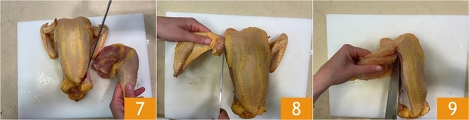 Schneiden Sie die Schenkel in Ober- und Unterschenkel 7. Nun trennen Sie auch die Flügel 8 und die Brust 9.