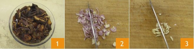Um das Hähnchen zuzubereiten, weichen Sie die getrockneten Pilze etwa 20 Minuten lang in lauwarmem Wasser ein 1. Schälen und hacken Sie die Schalotte 2 und den Knoblauch fein 3.