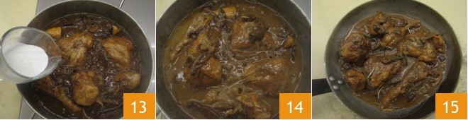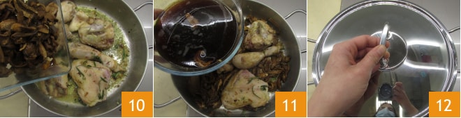 die gut abgetropften Pilze (werfen Sie das Wasser nicht weg, es wird später benötigt) 10, dann salzen und pfeffern Sie nach Geschmack. Filtern und verwenden Sie dann 300 g des Einweichwassers der Pilze 11. Decken Sie mit einem Deckel ab 12 und lassen Sie es 50 Minuten bei schwacher Hitze kochen, wobei Sie die Hähnchenschenkel gelegentlich wenden.