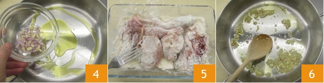 Geben Sie das Gemüse und etwas Öl in einen Topf 4 und dünsten Sie es etwa 7-8 Minuten bei schwacher Hitze an. In der Zwischenzeit geben Sie das Mehl in eine Auflaufform und mehlen die Hähnchenteile gut ein 5. Wenn die Schalotte angedünstet ist 6