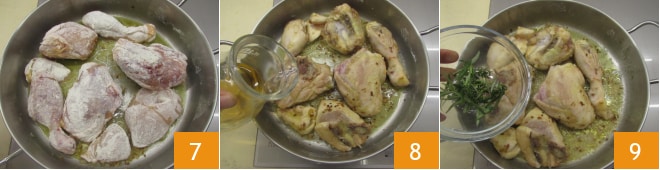 braten Sie auch die Hähnchenschenkel von beiden Seiten an 7. Löschen Sie mit dem Weißwein ab 8 und lassen Sie den Alkohol verdampfen: das dauert nur wenige Augenblicke. Fügen Sie die Aromen hinzu 9,