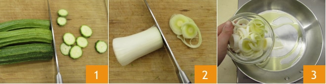 Um das Hähnchen mit Zucchinicreme zuzubereiten, bereiten Sie zuerst die Brühe nach unserem Rezept für Gemüsebrühe zu. Waschen Sie die Zucchini, schneiden Sie die Enden ab und schneiden Sie sie in dünne Scheiben 1. Entfernen Sie die äußeren Blätter des Lauchs und schneiden Sie ihn ebenfalls dünn 2. Erhitzen Sie etwas Olivenöl in einer Pfanne und geben Sie dann den Lauch hinzu 3.