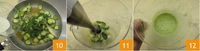 Geben Sie nun die Sahne hinzu 10, geben Sie die Zucchini in ein hohes Gefäß und pürieren Sie sie mit einem Stabmixer 11, um eine homogene Creme zu erhalten 12. Beiseite stellen.