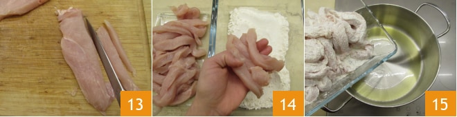 Schneiden Sie die Hähnchenbrust in Streifen 13 und mehlieren Sie sie sorgfältig 14. Erhitzen Sie etwas Olivenöl in einem Topf und geben Sie dann die Hähnchenstreifen hinzu 15.